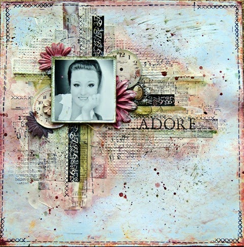 I started with paper layers on which I used a brick stencil and Viva Ferro "graphit"and random stamping. I used a Cherry Lynn Design stencil to create the chicken wire.