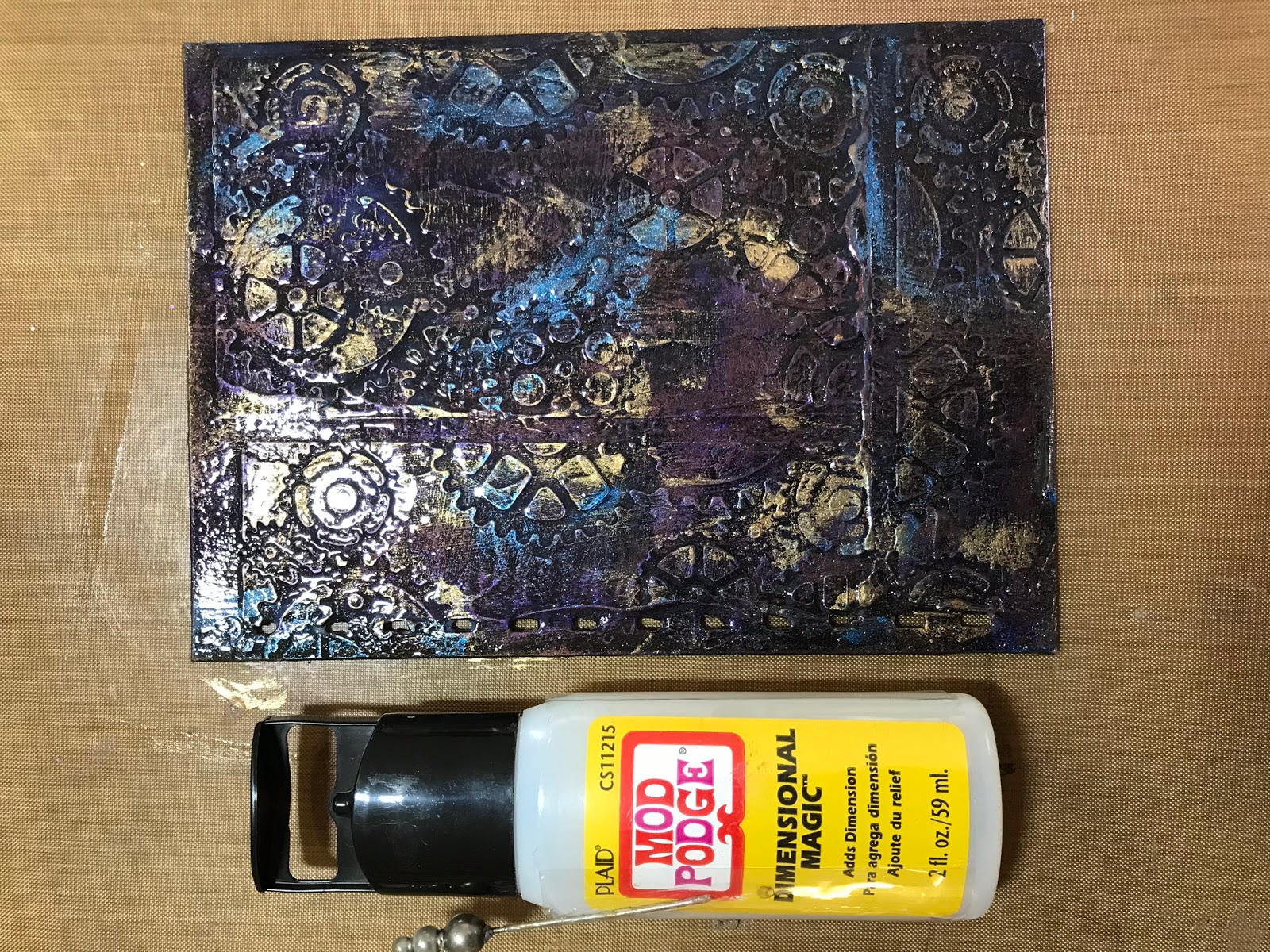 I then painted the chipboard pieces with white gesso and then Finnabair Art Alchemy Sparks Paints. Final touches with Prima Melanges, art stones, glitter mix and glass beads