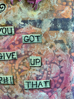 This page was what I call a "cheat page". The junk journal already came with this premade gelli paper so I only had to add a black Mandala and a quote from the Art Words Transparency. I find pages like this one, and the next one are great to use a mojo starters.