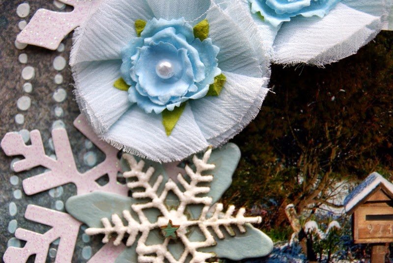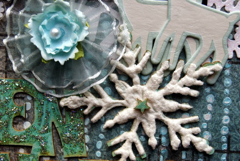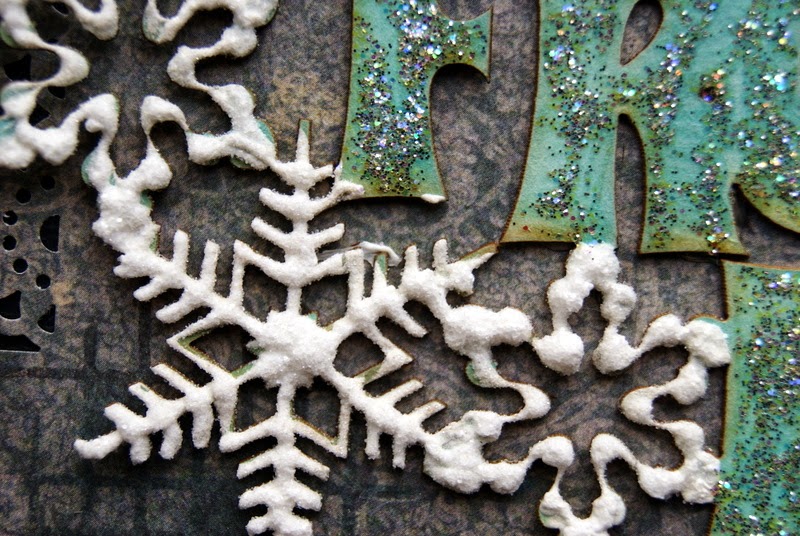 I used a Prima Stencil and modelling paste, then applied Shimmer Paintz spray. The chipboard is from Which Craft Do You Do and I have used Puff Paint to create a snow effect.