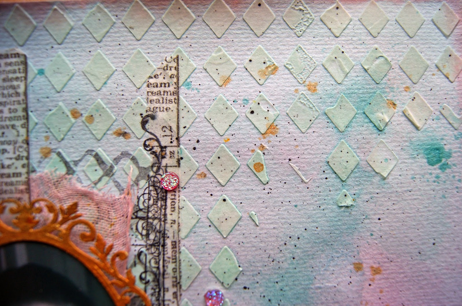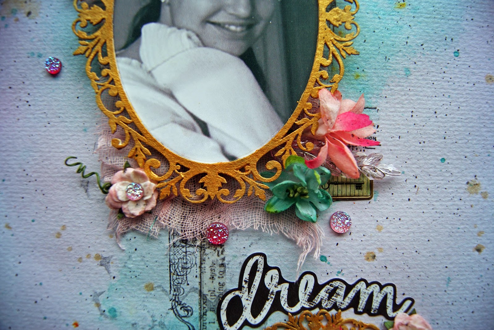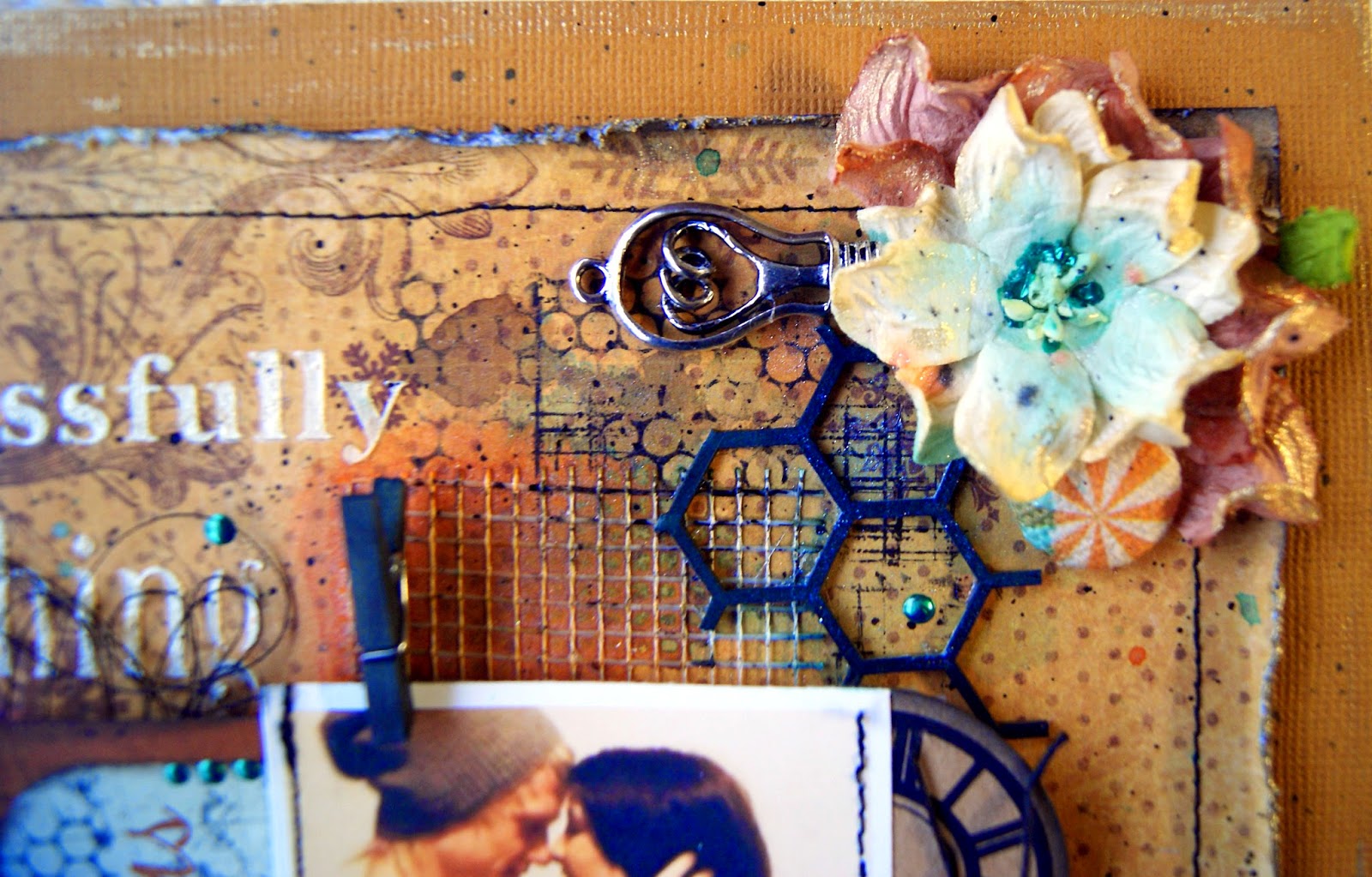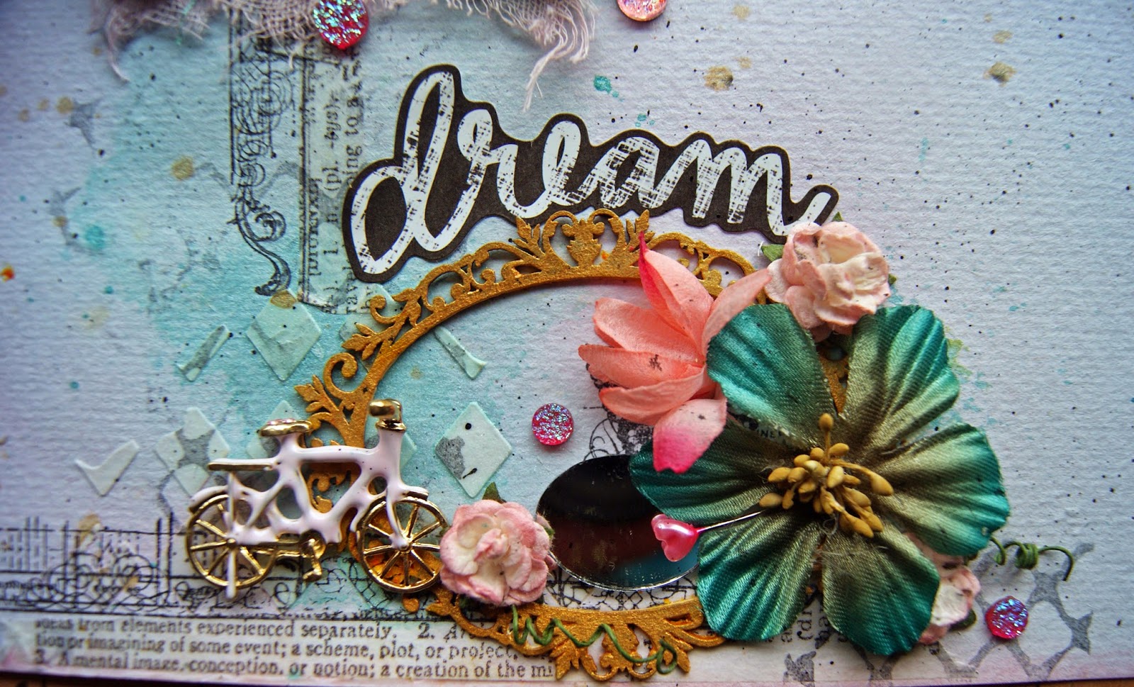 I used Bo Bunny Back to Basics paper and cutouts.For the background texture I covered the paper with Clear Gesso and then used Glimmer Mist Dreamiscle and Radiant Rain Shimmering Mist by Luminarte in Bashful Blue. I added mesh tape and stamped randomly on the paper. The stenciling was done using a Prima Stencil and Viva Modelling creme - Mother of Pearl. The chipboard was painted with black gesso. I highlighted the edges and flowers with Luminiere Brass paint.