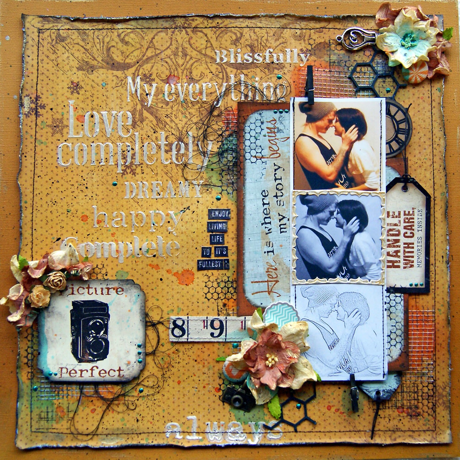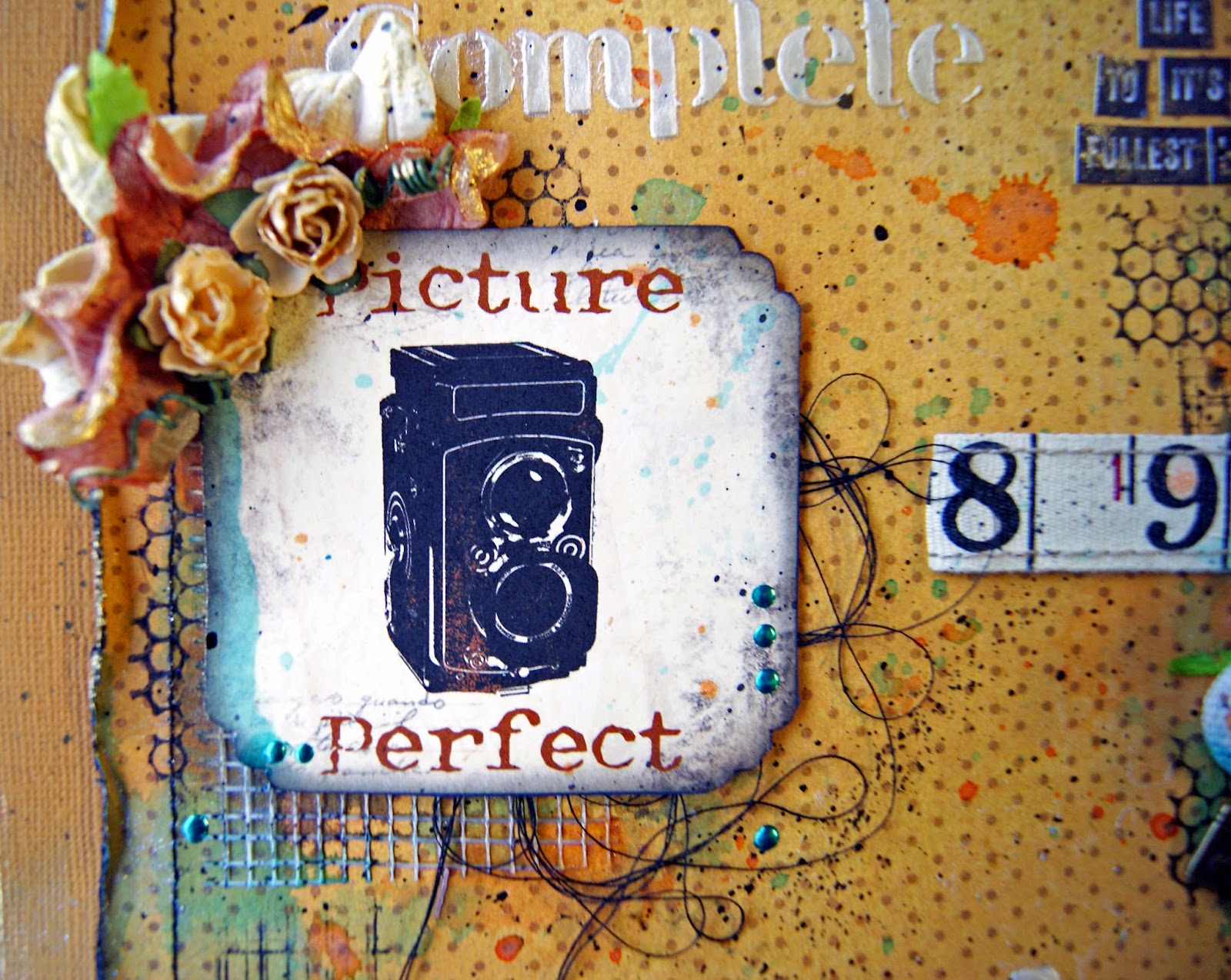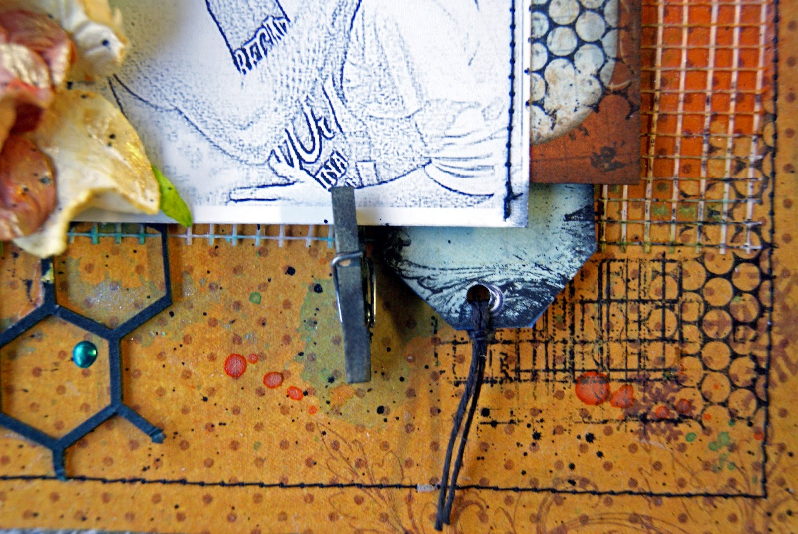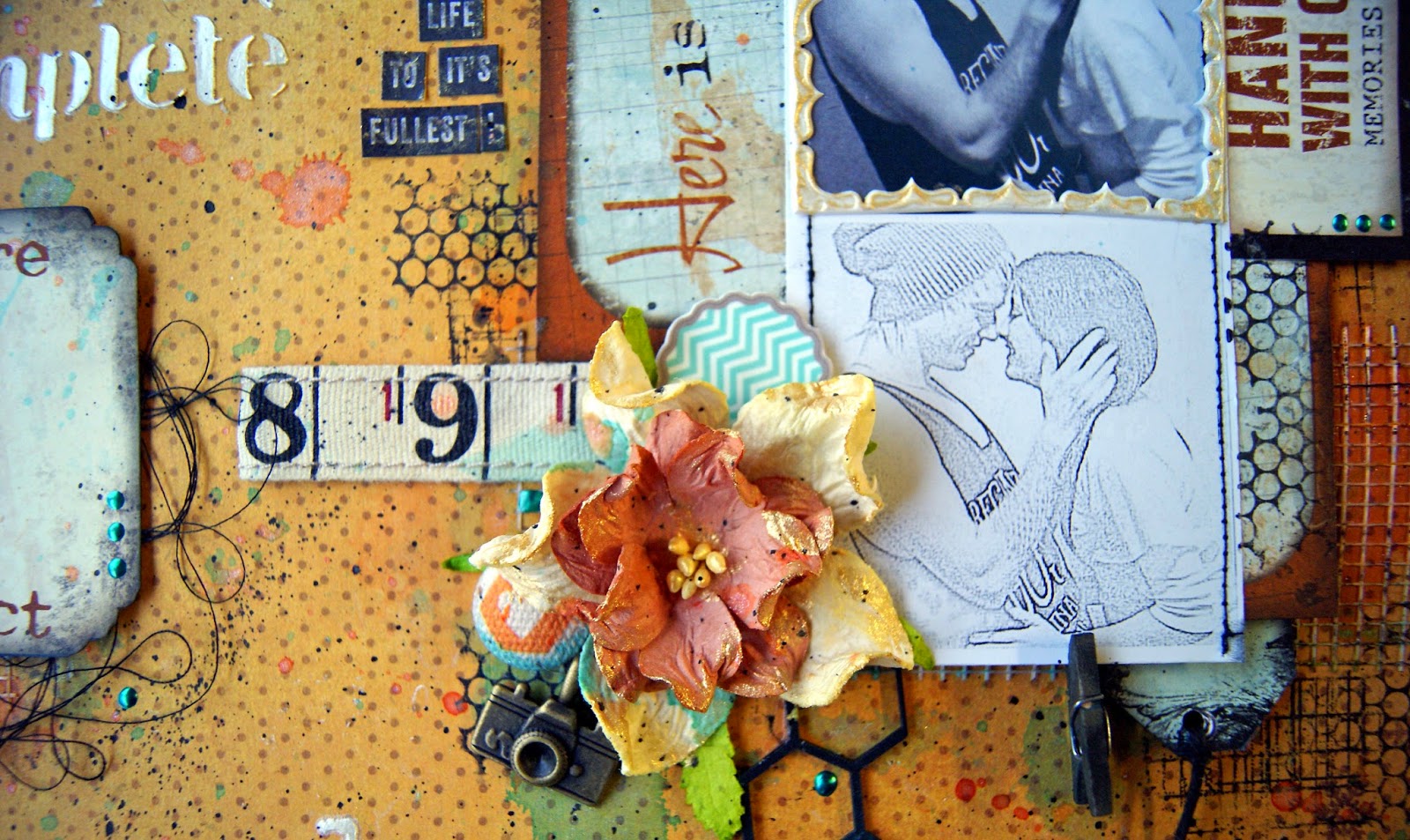 I used Bo Bunny Back to Basics paper and cutouts.For the background texture I covered the paper with Clear Gesso and then used Glimmer Mist Dreamiscle and Radiant Rain Shimmering Mist by Luminarte in Bashful Blue. I added mesh tape and stamped randomly on the paper. The stenciling was done using a Prima Stencil and Viva Modelling creme - Mother of Pearl. The chipboard was painted with black gesso. I highlighted the edges and flowers with Luminiere Brass paint.