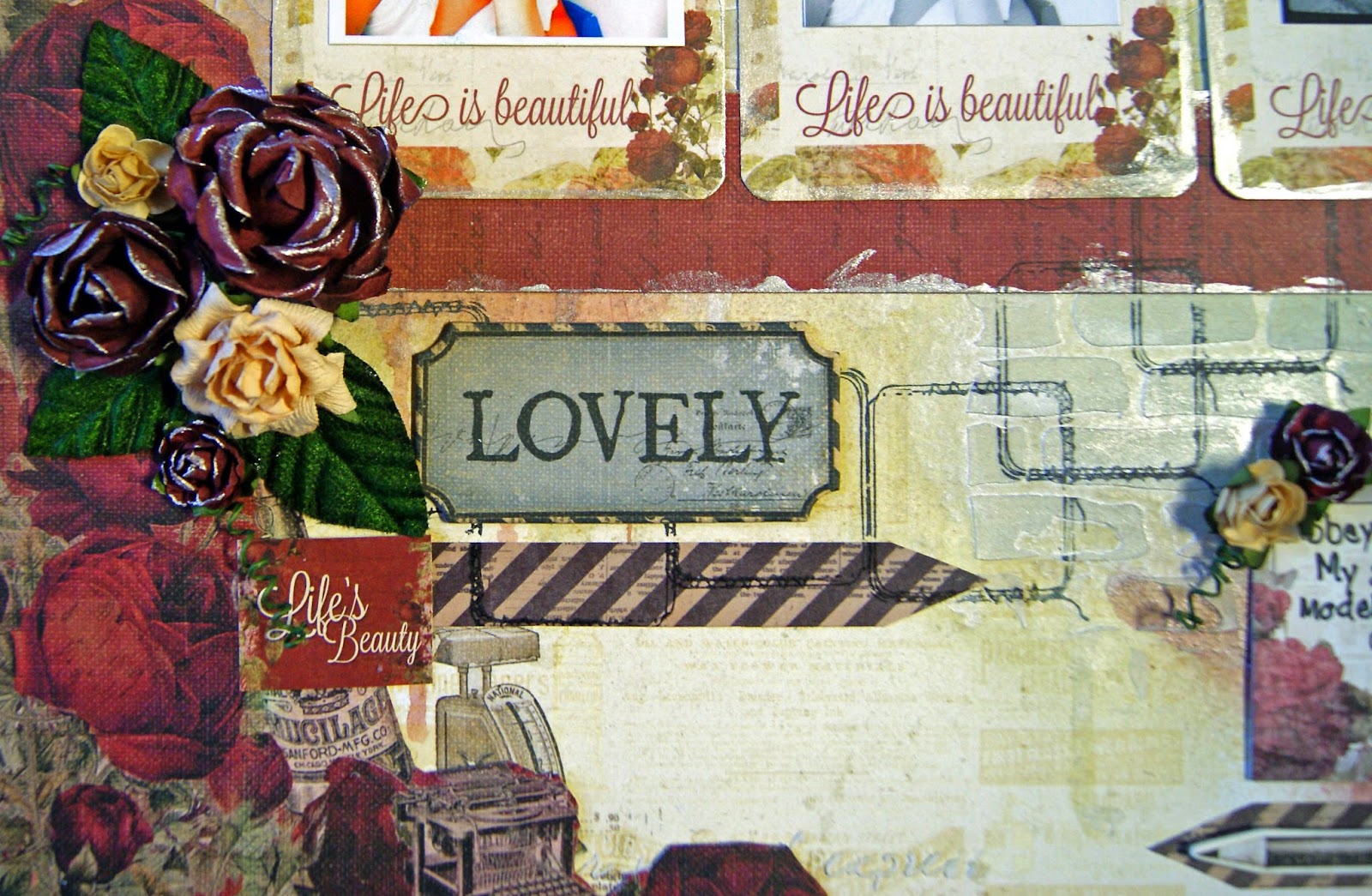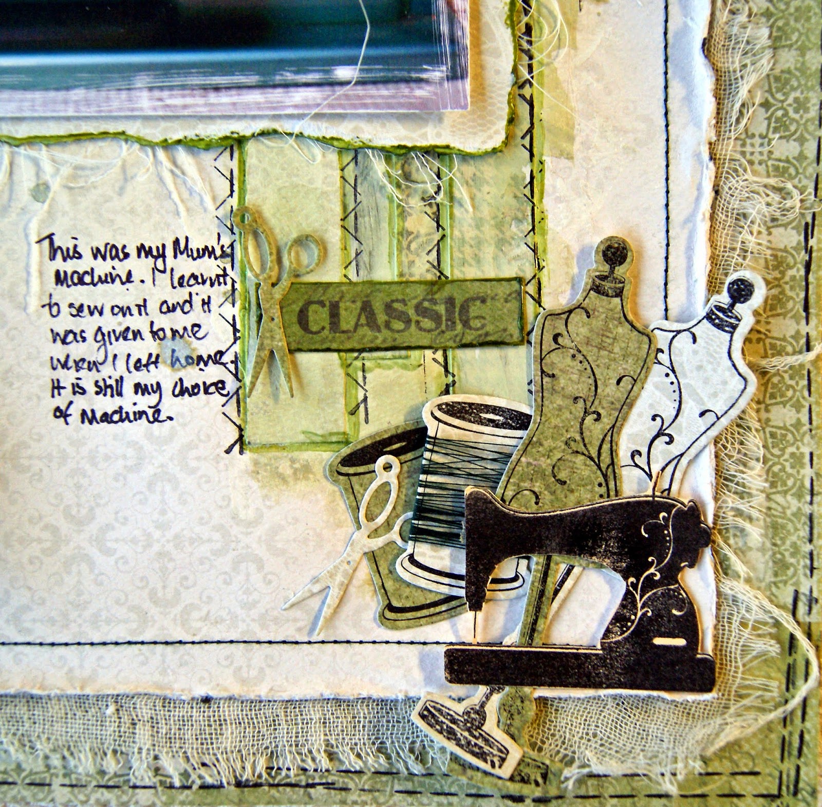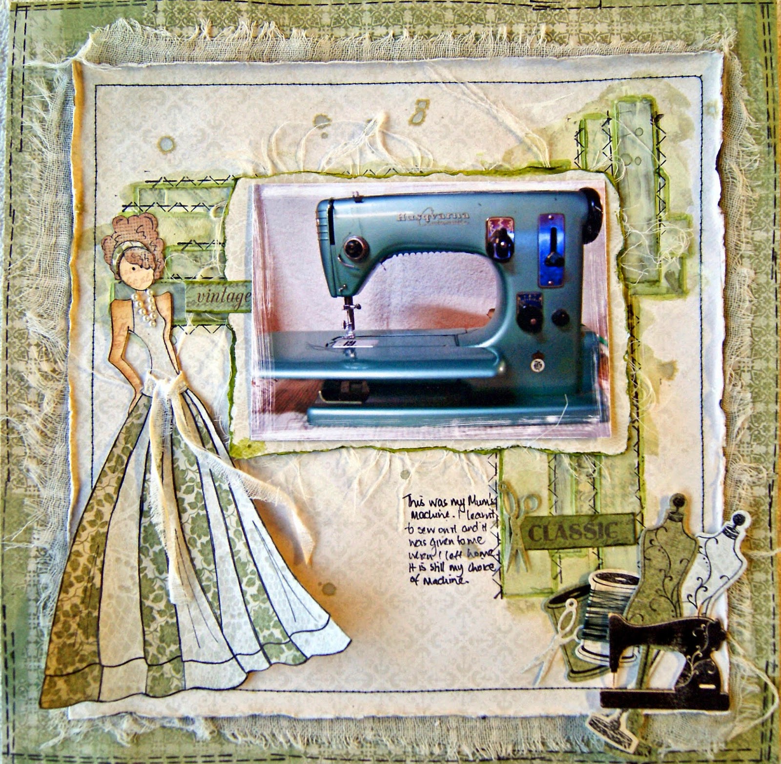 This photo is of my treasured sewing machine. This was given to my mum when she was 21 and then she gave it to me when I left home. It has been so faithful and I would never trade it for a modern one - it did the sewing on this layout!