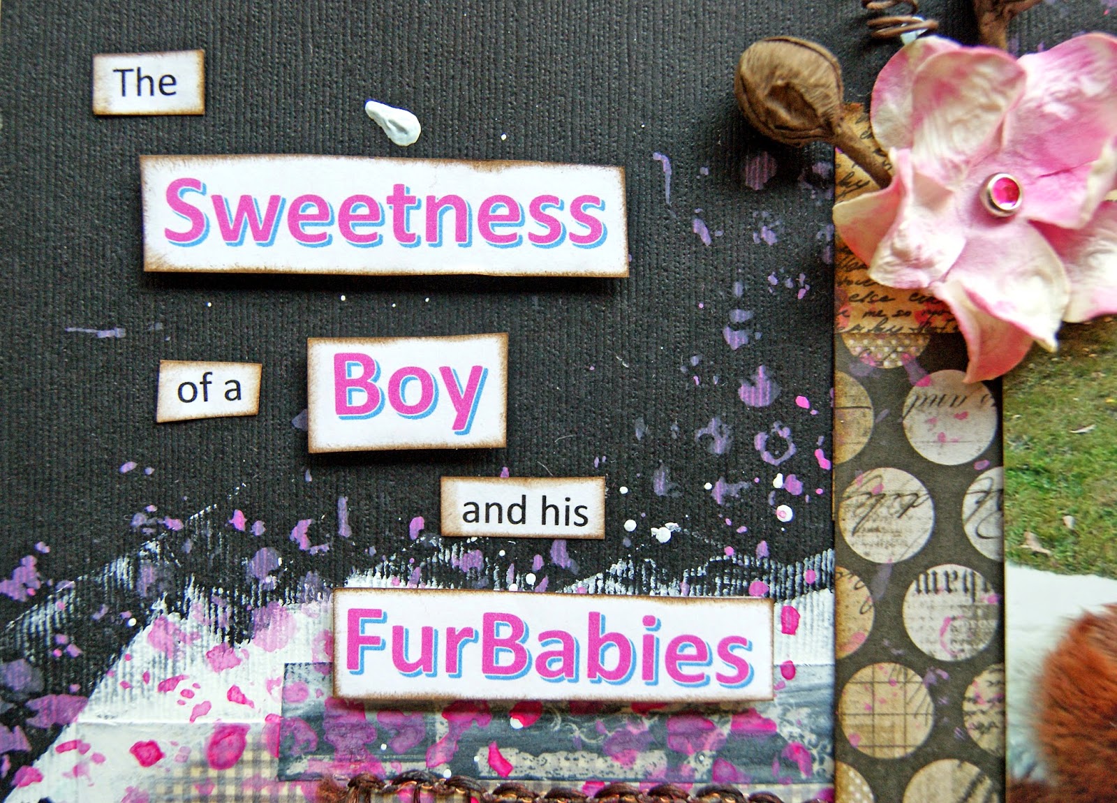 This photo was taken a few years back of my son and our two St Bernards. I used Distress Paint - Picked Raspberry and bubble wrap to create the color in the background. I also colored the flowers (iamroses) with the distress paint. The chocolate flowers are from Prima. Here is the sketch and challenge details: