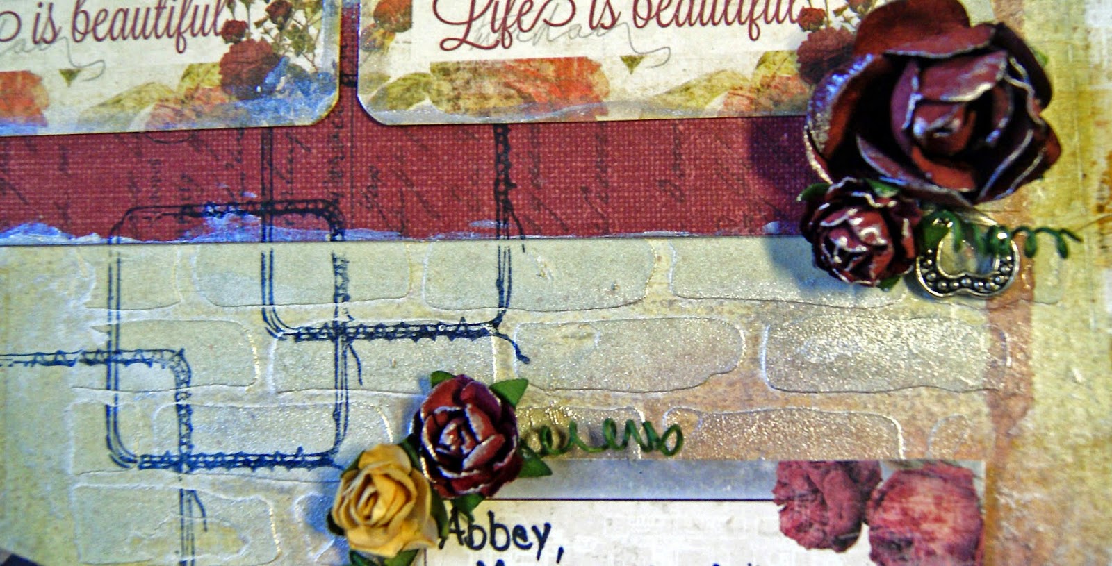 I used paper from Prima - Stationers Desk Collection which I love. I fussy cut the piece on the left and added flowers from iamroses. I have used two stencils in the background - brick stencil and art word. On top of the texture paste and throughout the background I sprayed Glimmer Mist Latte and Lindy Stamp Gang - Sea Grass Green. Once dry I applied Lumiere Paint - Pearl White to the bricks and flowers.