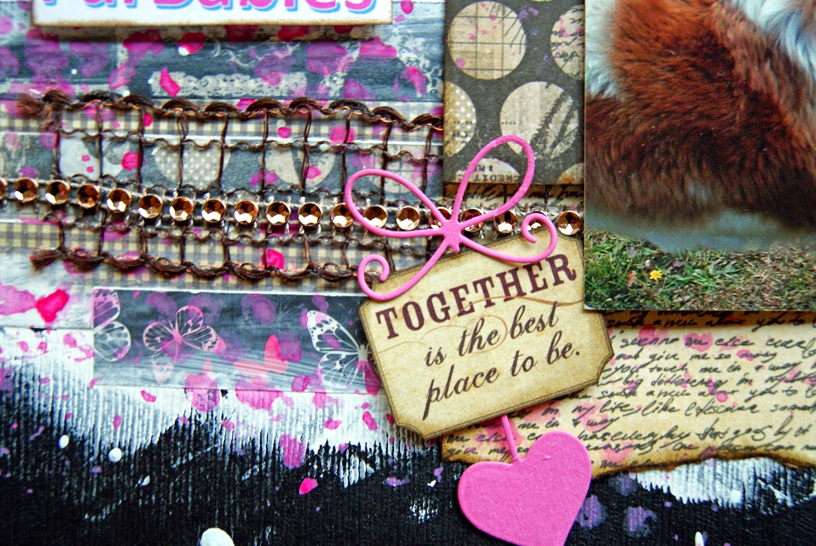 The hearts have been diecut and the edges inked with black soot distress ink. Other products used - Kaisercraft Rhinestones, and washi tape.