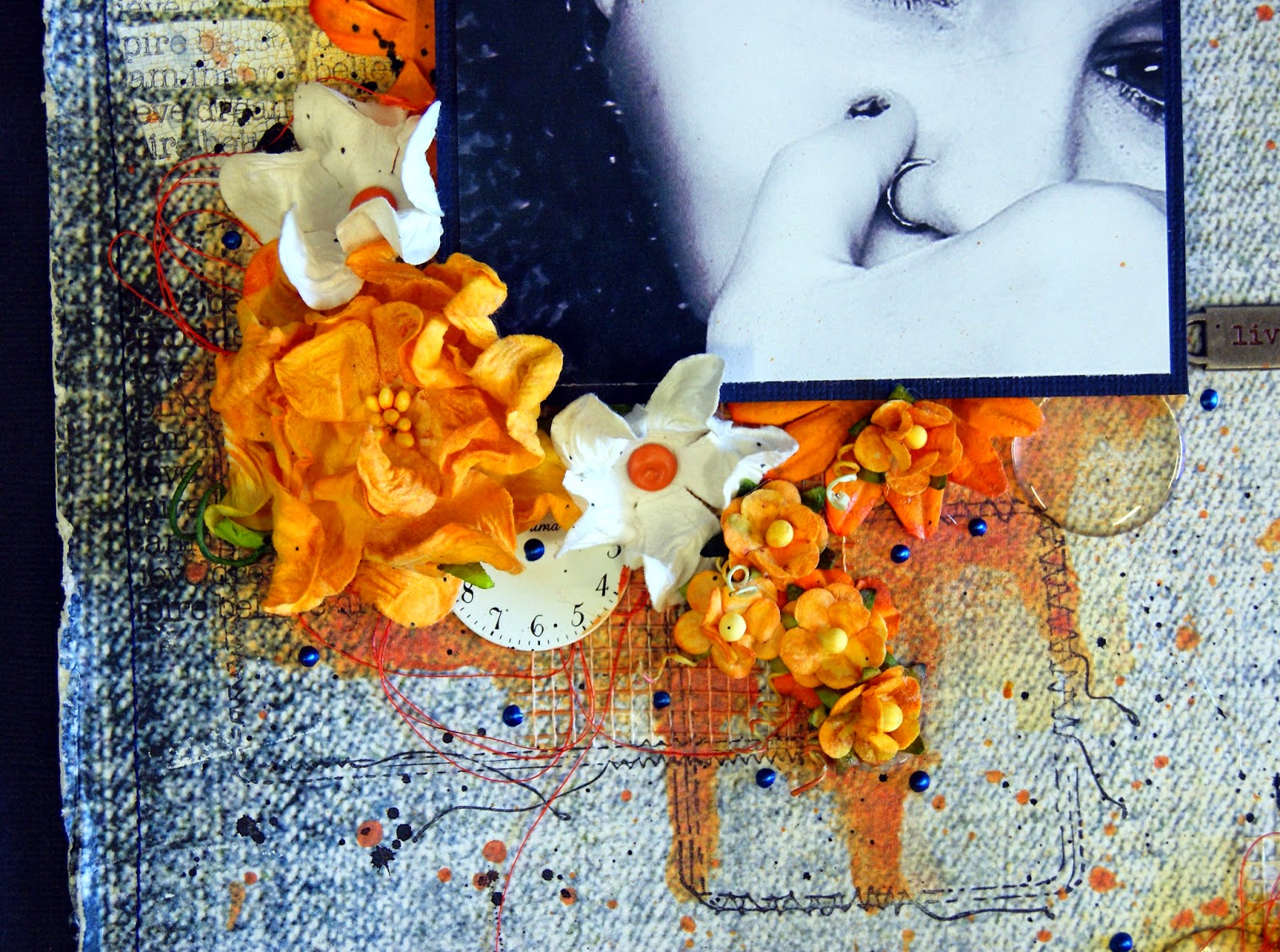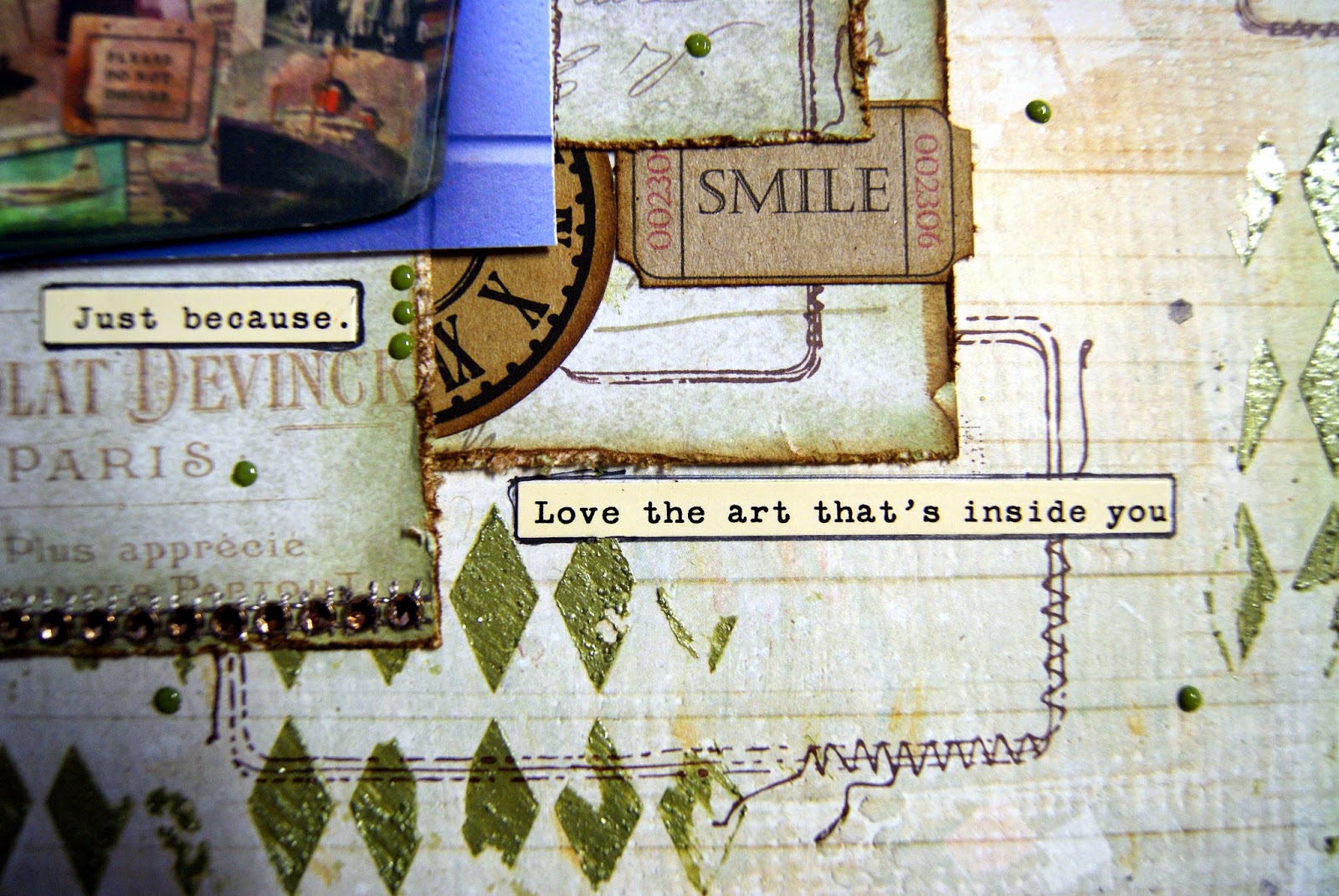 The base paper is 7 Dots, Messy Head collection "Big Words". I used a Heidi Swapp stamp and LSG Embossing Powder Geranium Coral Blush. - this is a bit difficult to pick up in the photo. I also used Sweet Violet Teal , Delphinium Turquoise, Flat Fabio Frenchy's Pink Pouf on the background.