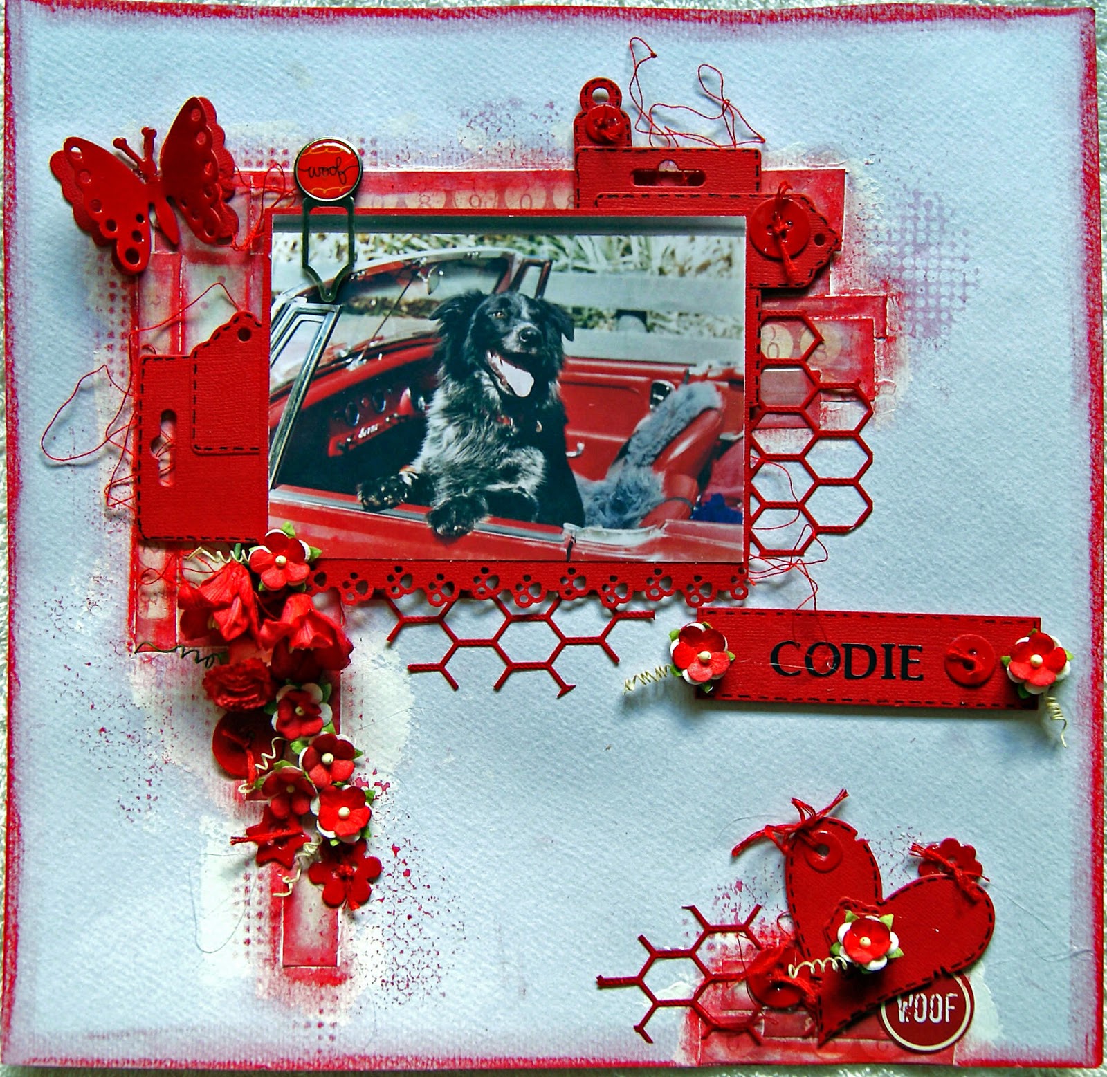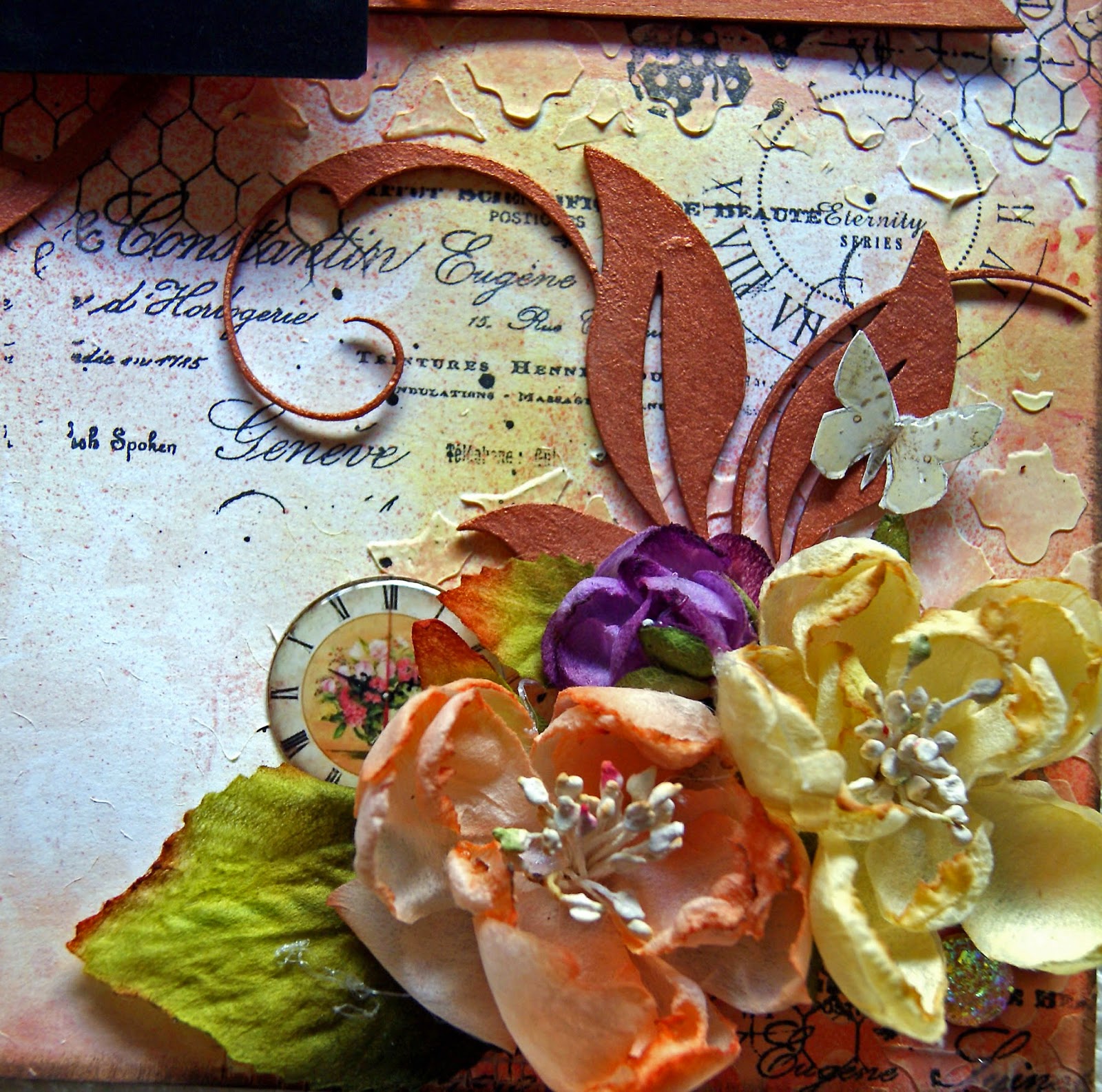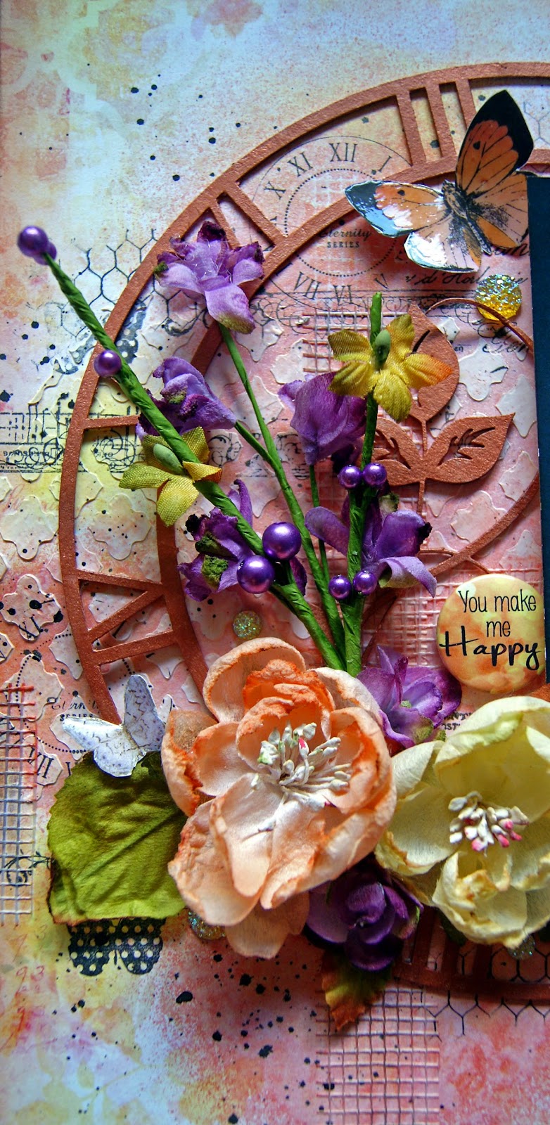 The butterflies were created by using the above inks on watercolour paper, stamping with a Heidi Swapp stamp and then die cutting with Tim Holtz Butterfly die cut and covered with Dimensional Magic. I also sprayed the chipboard with these colours and embossed using the Geranium Coral Blush Embossing Powder. I stamped the Deep Red chicken wire stamp using White chalk ink. Here are some close ups: