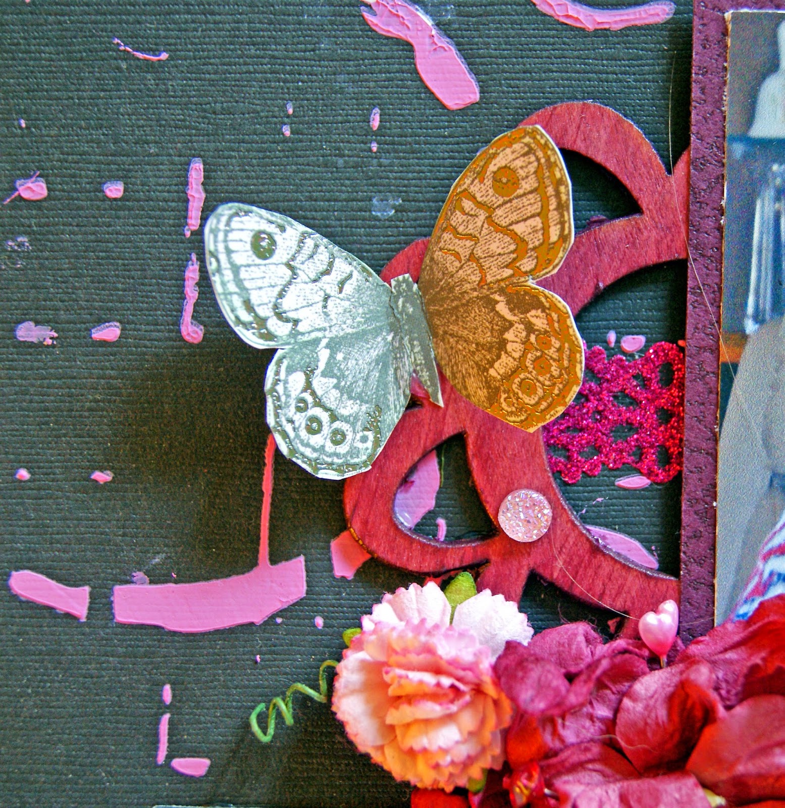 I created the background using a Crafters Workshop stencil and modelling paste coloured with Tim Holtz distress paint "Picked Raspberry". The chipboard has been coated with Viva Facetten-Lack Coco Crackling "Black n Berry". Flowers are from iamroses and Flourish with a Bling. I fussy cut the butterflies from Maja Design and Kaisercraft Paper. Finishing touches include a Maja Road pin, Washi Tape and Prima "say it with crystals".