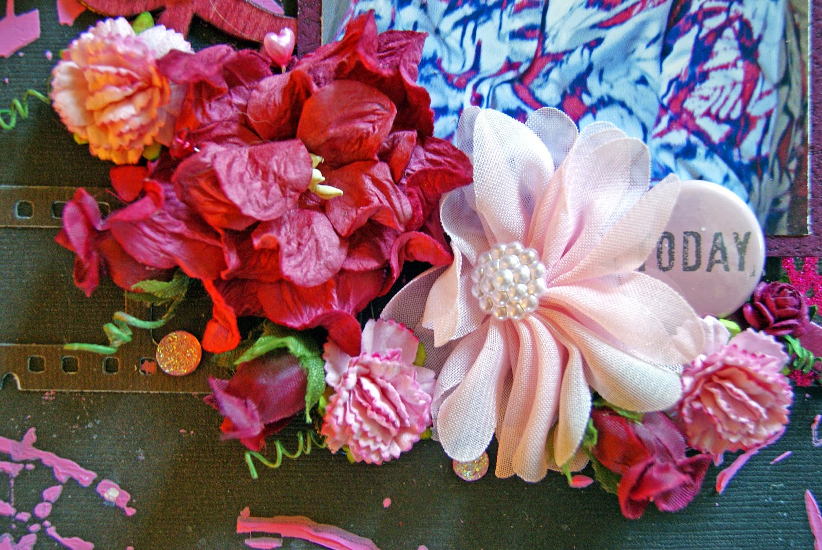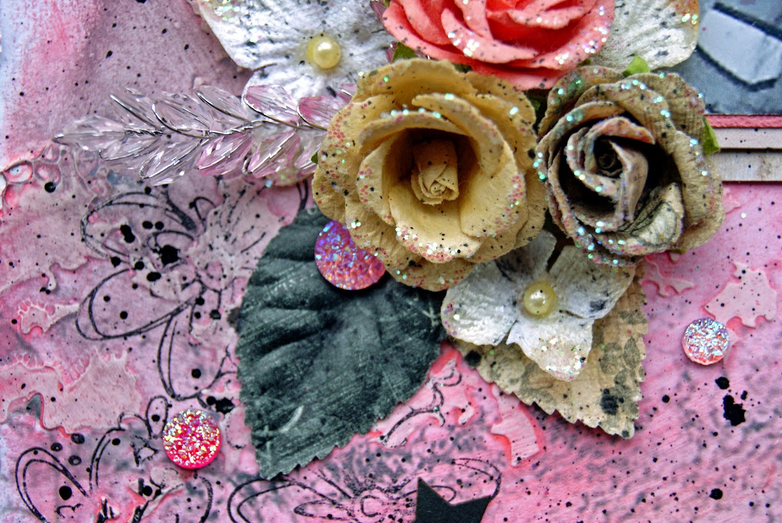 I created the background using a Crafters workshop stencil and black gesso. I used silks acrylic glaze - Apricot Nectar and Heidi Swapp Color Shine - Peach for the background colour. I chose these colours to blend in with the beautiful D-lish flowers.