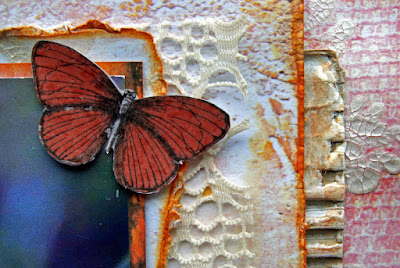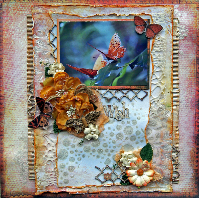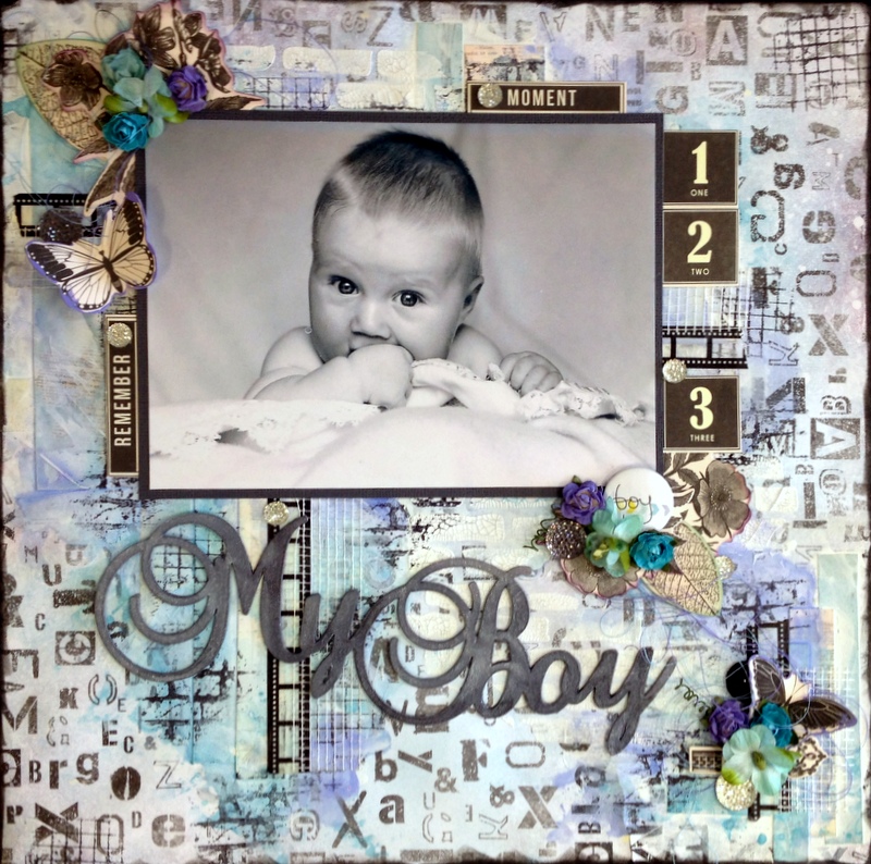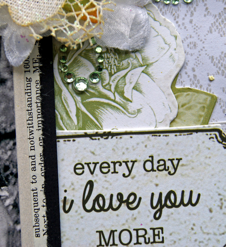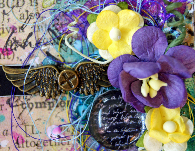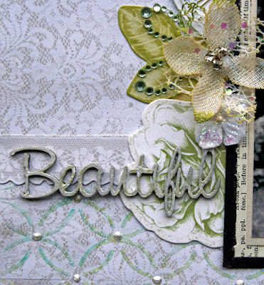 The paper behind the photo is old dictionary paper and Kaisercraft Collectables - Provincial Collection. The flowers are Prima and Petaloo, and I have pulled apart a Kaisercraft Rhinestone flower and tucked the pieces behind the flowers. The ScrapFX Chipboard title has been covered with gesso and painted with water colour paints and a sprinkle of glitter.