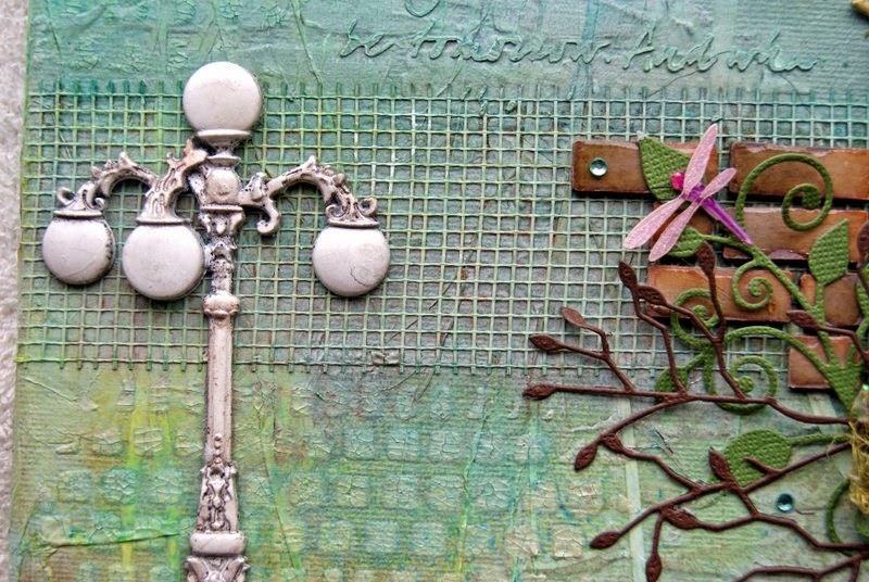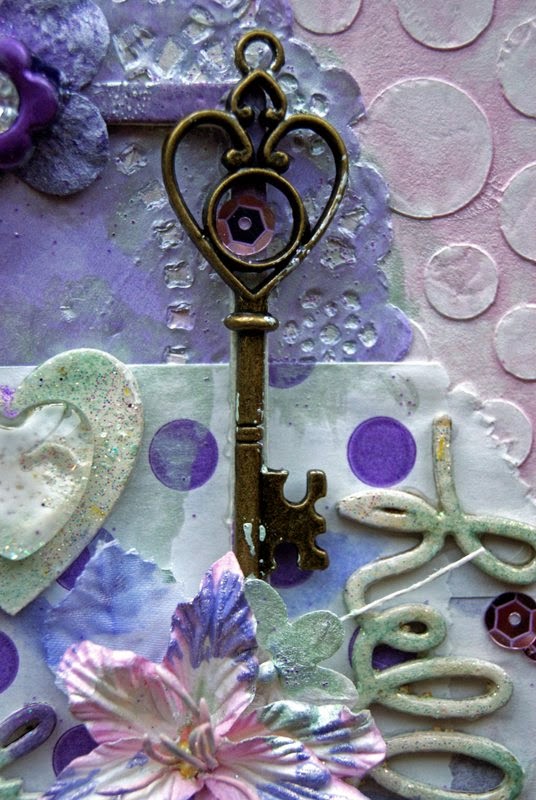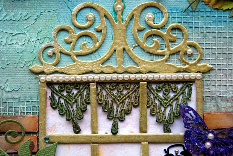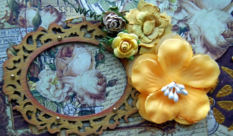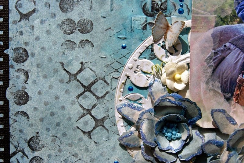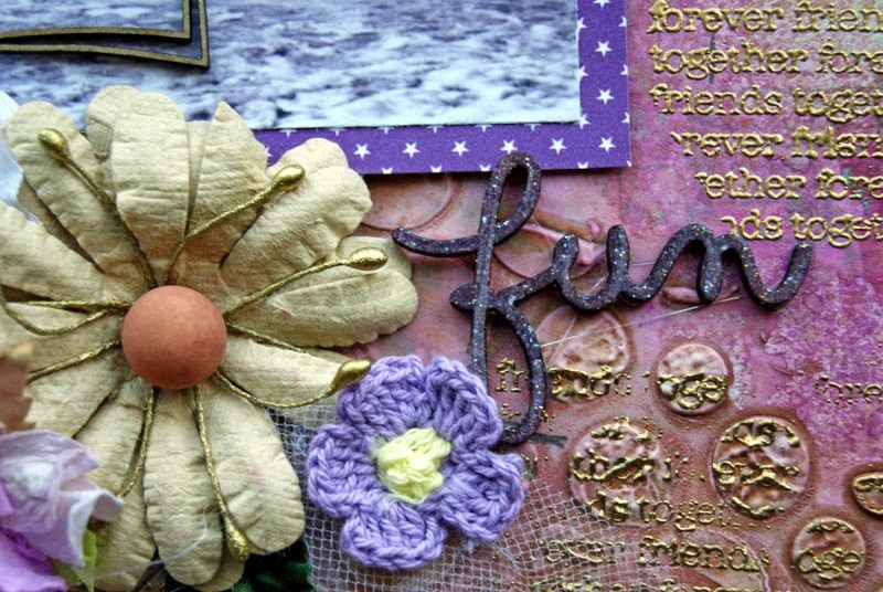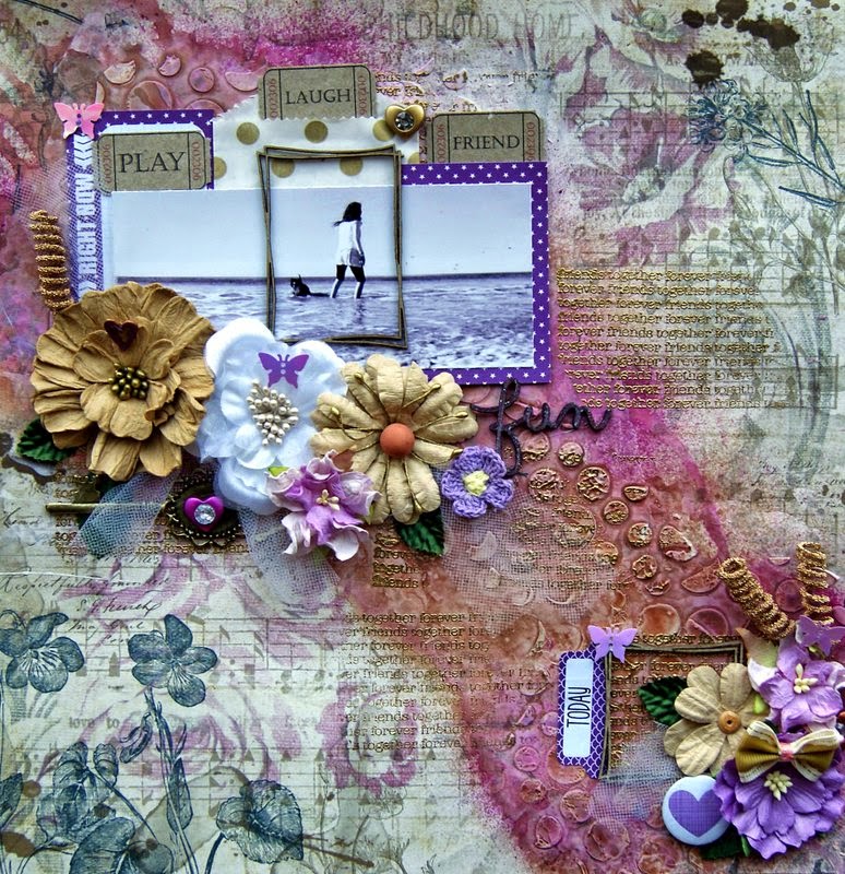 Again I have fussy cut alot of items from the papers and added them to my layout. The background stencil is the large doilee from kaisercraft with gold cracking paint.