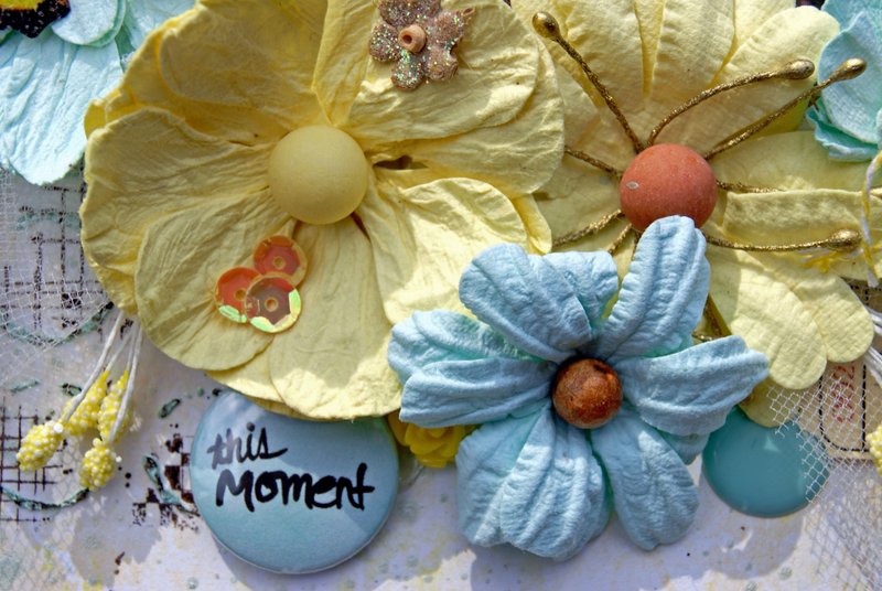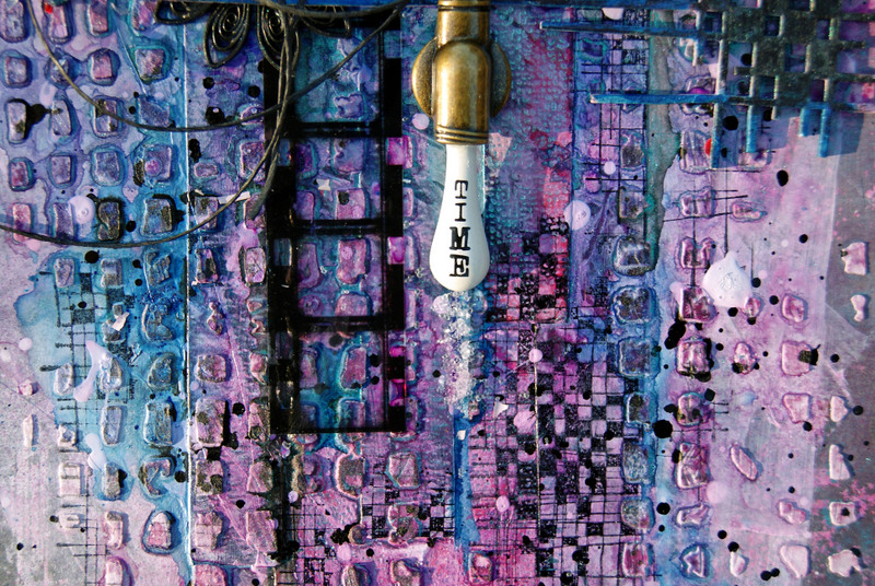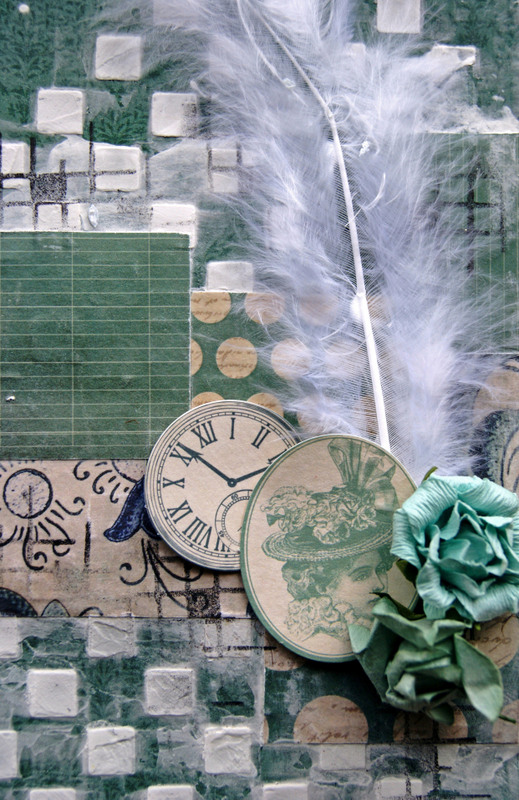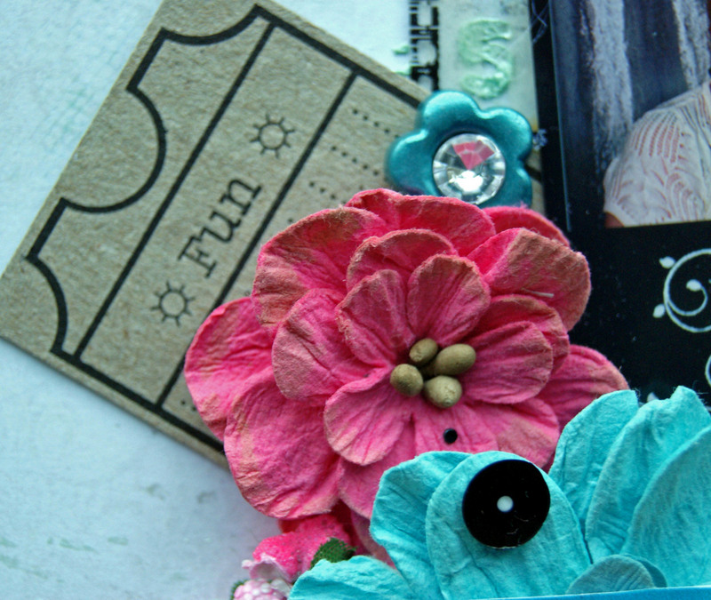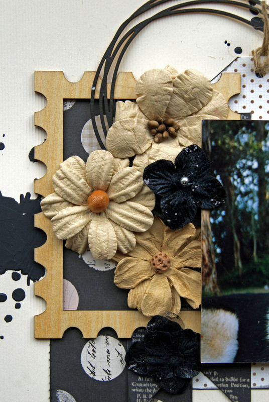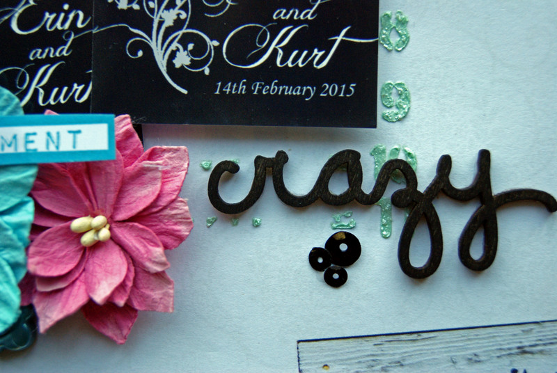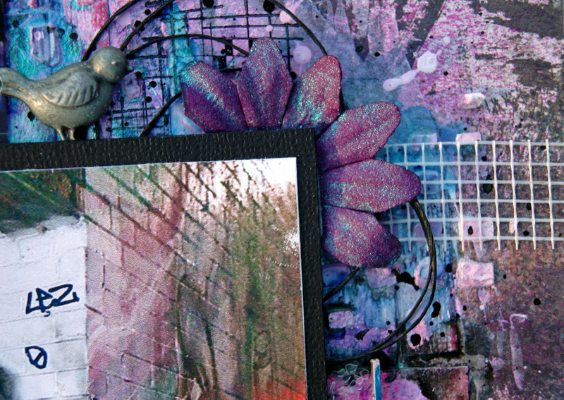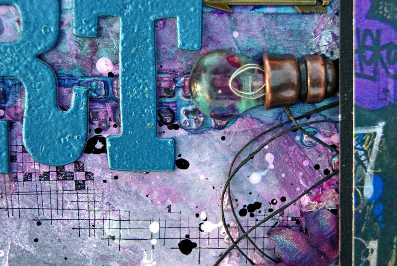 The chipboard and title have been painted with Tim Holtz Paints and embossed using crystal glitter embossing powder.
