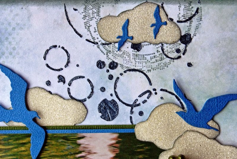 I have used cardstock by Blue Fern Studios - Ombre Dreams. This paper is so thick and awesome to work with. The clouds I created using a Memory Box stencil that I traced and cut out. The birds are from a Impression Obsession Die cut. The background is also using a Memory Box stencil and Shimmer Paints Texturez = Teal me no Lies.
