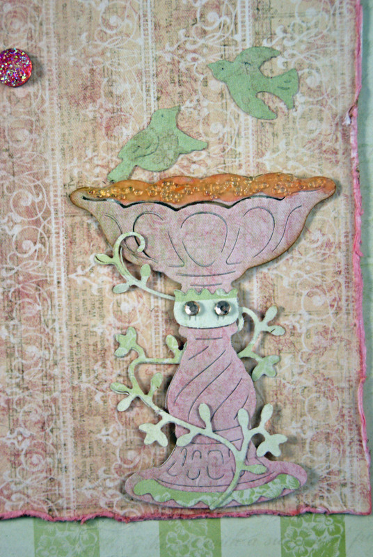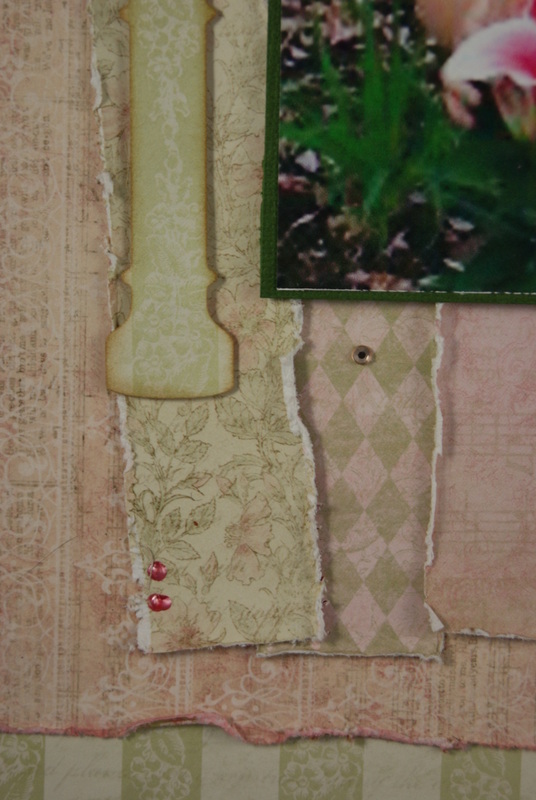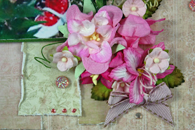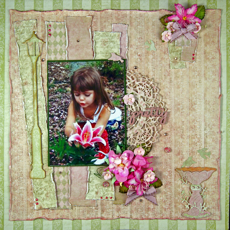 I have used plain card stock for the layers to offset such a busy background. I have added a few flowers from Iamroses and die cut doilees. The chipboard title is from Dusty Attic which was a special run for the retreat. I have embossed this using Zing Metallic Blue powder.