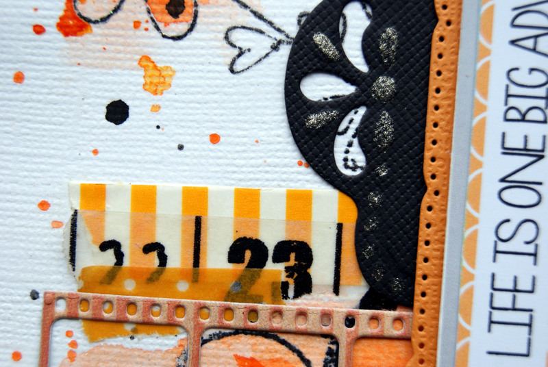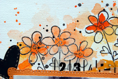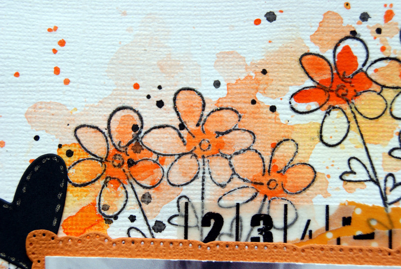 I have used white cardstock with orange cardstock behind. To create the background I have stamped flowers with black ink and clearing embossing powder. I have then randomly applied two different shades of orange water colours around the embossed images. My photo mat has been created using die cuts from Memory Box, Spellbinders, Samantha Walker, and Die-namics as well as a few strips of washi tape.
