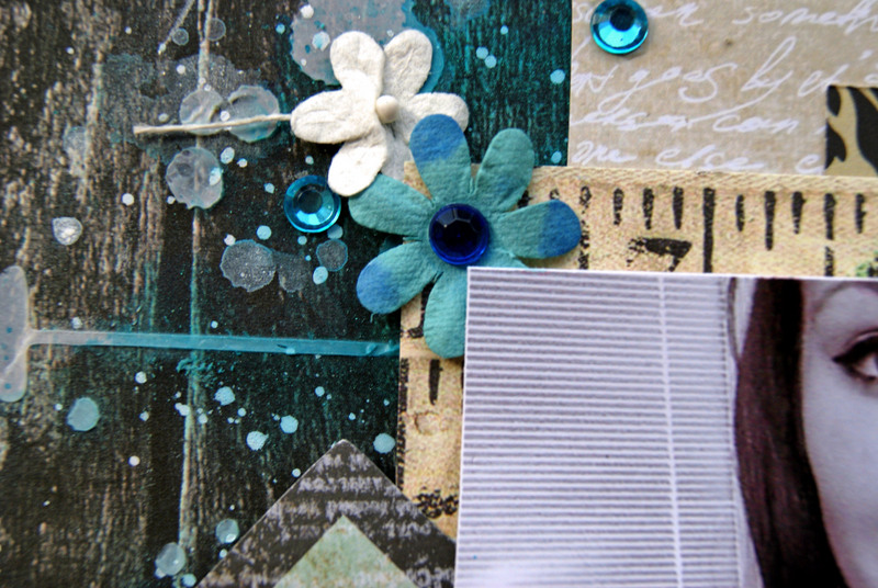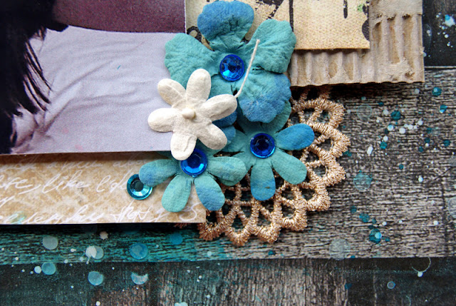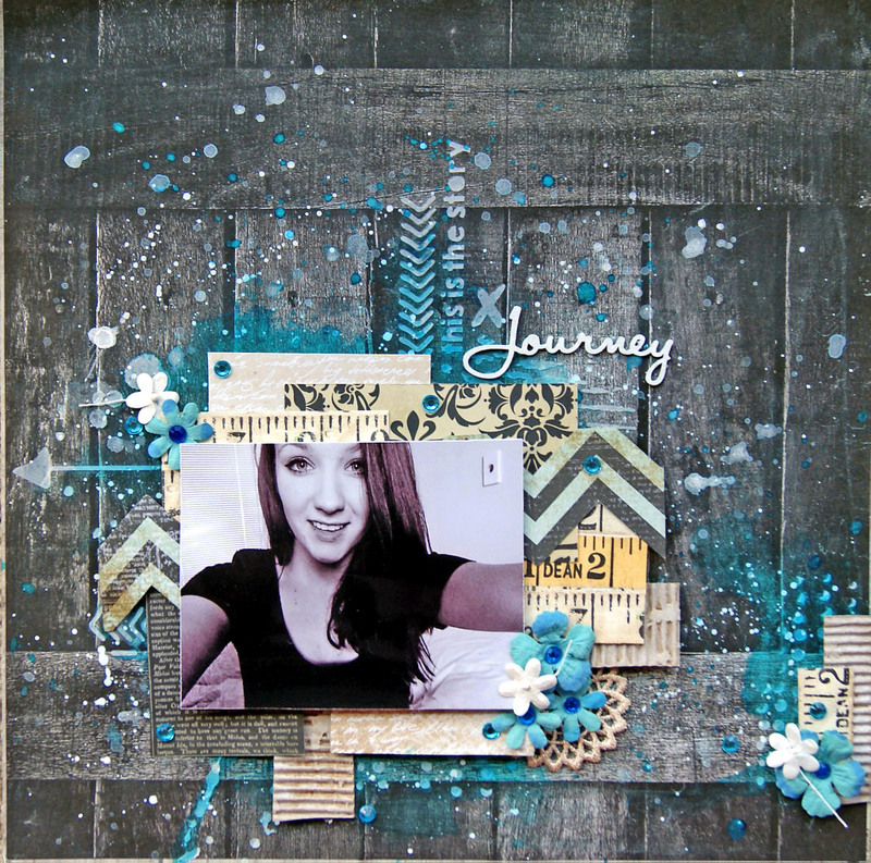 I have used paper by 7 Dots "walk the plank", a The Crafters Workshop Stencil "the story" and texture paste to create the background. Once dried I applied Lindy Stamp Gang Starburst mist "delphinium Turquoise" and "frozen jack frost". A few more splatters with watered down gesso and the background is done. I have used Pebeo Paint "white" on the chipboard title and layered the photo mat with assorted paper scraps from my stash. The flowers are Petaloo and a touch of bling brings the layout together.