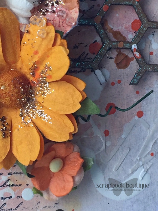 I prepped my page by covering it with clear gesso and then I created the background by first using a Donna Downey Stencil - Scribble Script and modelling paste. I then added Tim Holtz Paint - Rusty Hinge and Ripe Persimmon. Using the tags from the tag sheet and some cut up pieces from the 6x6 paper pad. I have then stamped randomly around where the photo mat sits with a number and script stamp.