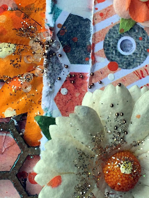 Splatters have been made using watered down gesso and Lindy Stamp Gang California Poppy Gold as well as the two Tim Holtz paints -- Rusty Hinge & Ripe Persimmon.