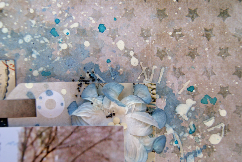 I have used a Crafters Workshop Stencil - Mini Time Travel and inks - Tattered Angels - Glimmer mist - Jazz Blue, Abominable Snowman and Denim Blue in the background together with gesso.