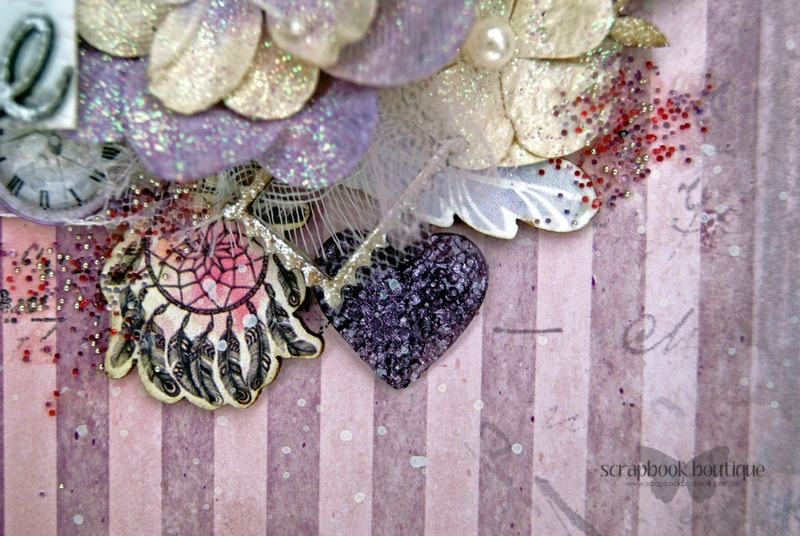 I have then sprayed the canvas panel in areas where I wanted to sprinkle glitter with a spray fixitive and added Finnabair glitter.