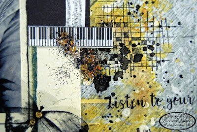I started with 13 Arts Paper from Aria Story Collection. I created the background using the Memory Maze stencil and whipped spackle randomly around the area of the photo. I have then used Tim Holtz Distress Oxide Ink, Fossilized Amber and water, drying between the layers.